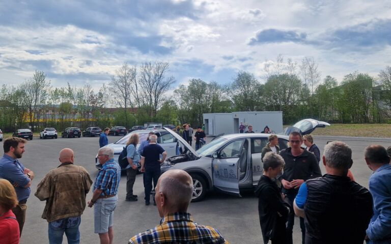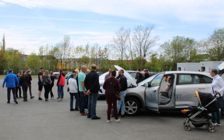 Auch in den beiden im Außenbereich aufgestellten Versuchscontainern wurden Einblicke in die Projekte zur Ammoniakzerlegung und zur Nutzung von mittels Hydrolyse entstandenem Sauerstoff gegeben. Besonders das Thema der zukünftigen Mobilität genoss großes Interesse bei den Besuchern, was sich an vielen Fragen zu den im Innenhof ausgestellten Brennstoffzellen- und Elektro-Fahrzeugen zeigte. In der Versuchshalle hatten die Gäste zudem die Gelegenheit an verschiedenen Infoständen des Instituts Informationen zu weiteren Projekten zu sammeln oder schlicht mit den Mitarbeitern ins Gespräch zu kommen.