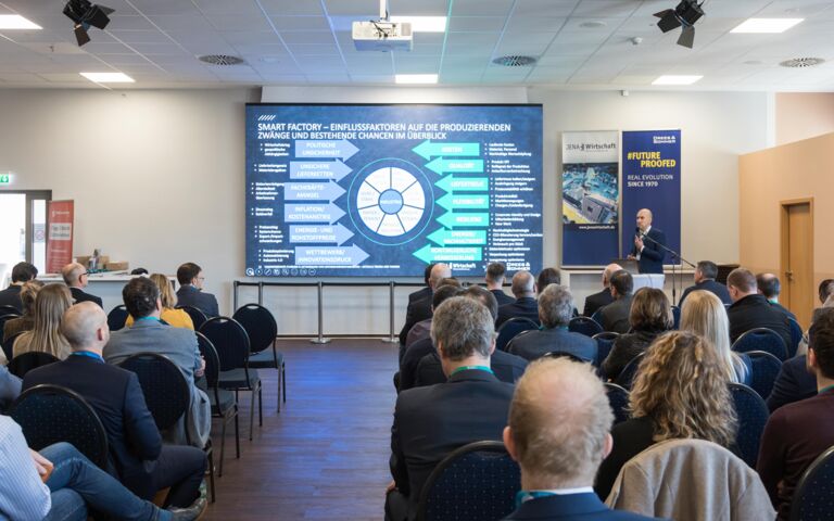 Im Rahmen von Fachvorträgen und Workshop wurden zukunftssichere Produktion mit „smarten“ Lösungen und Nachhaltigkeitsstrategien, neue Arbeitswelten und weitere Themen besprochen. Dr.-Ing. Tobias Wätzel, wissenschaftlicher Leiter des HySON-Instituts, referierte über die Einsatzpotentiale von Wasserstoff in den genannten Themenfeldern. Somit erhielten die Teilnehmer aus Jena, Thüringen und ganz Mitteldeutschland umfängliche Impulse rund um wichtige Zukunftsfragen für ihre Unternehmen.