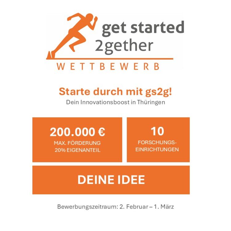 get started 2gether wird gefördert durch das Thüringer Ministeriums für Wirtschaft, Landwirtschaft und Ländlichen Raum (TMWLLR) und vom Forschungs- und Technologieverbund Thüringen e. V. (FTVT) organisiert. Unterstützt wird das Programm von der bm-t beteiligungsmanagement thüringen GmbH, der Mittelständische Beteiligungsgesellschaft Thüringen mbH, der Sparkasse Mittelthüringen und der Stadtverwaltung Apolda.