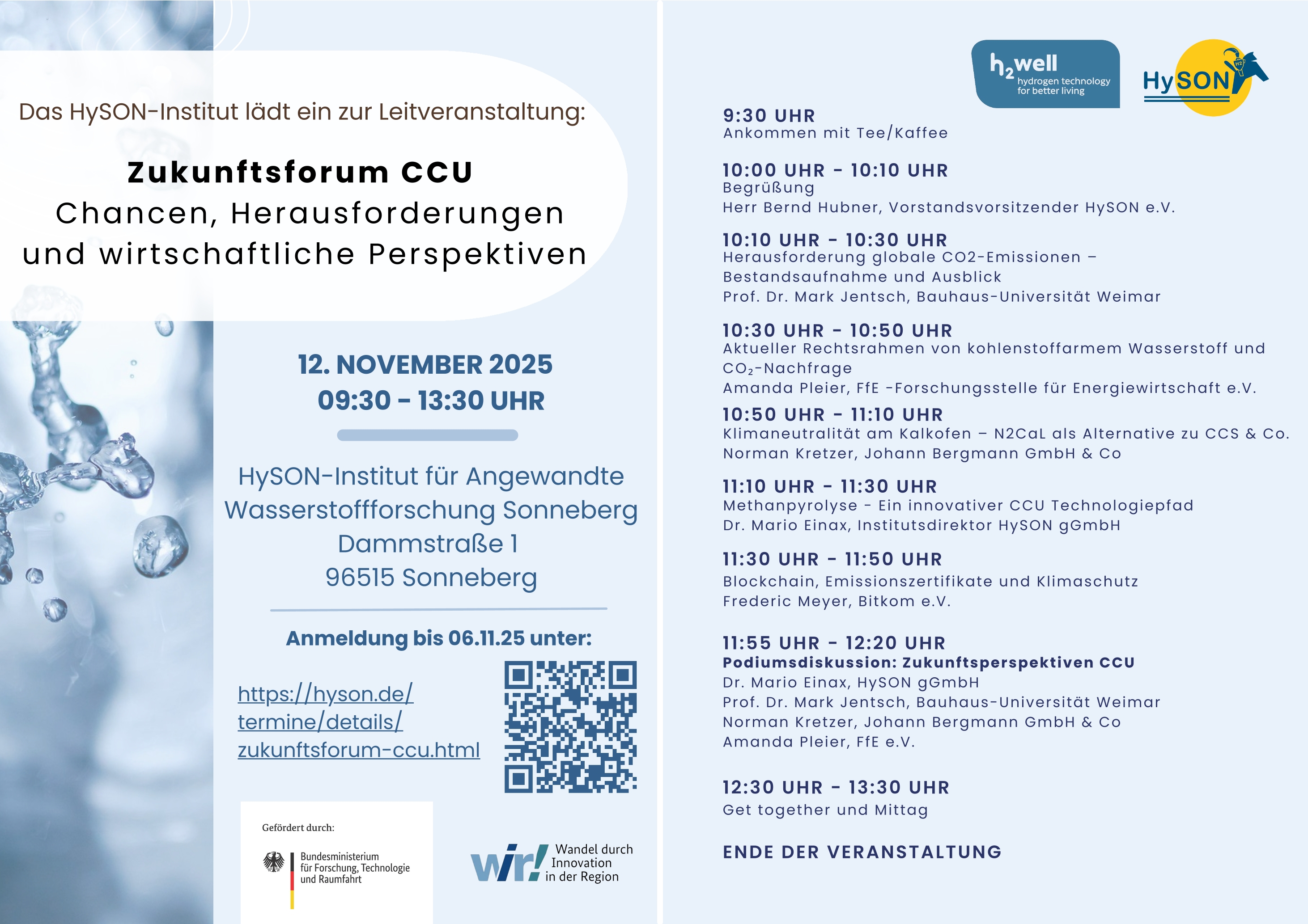 Das HySON-Institut und der HySON Förderverein laden Sie herzlich ein zu einer Leitveranstaltung zum Thema Chancen, Herausforderungen und wirtschaftliche Perspektiven von Carbon Capture & Utilization.